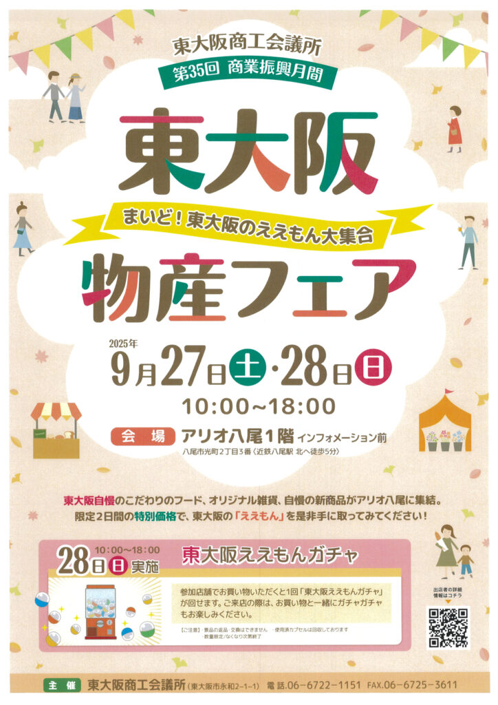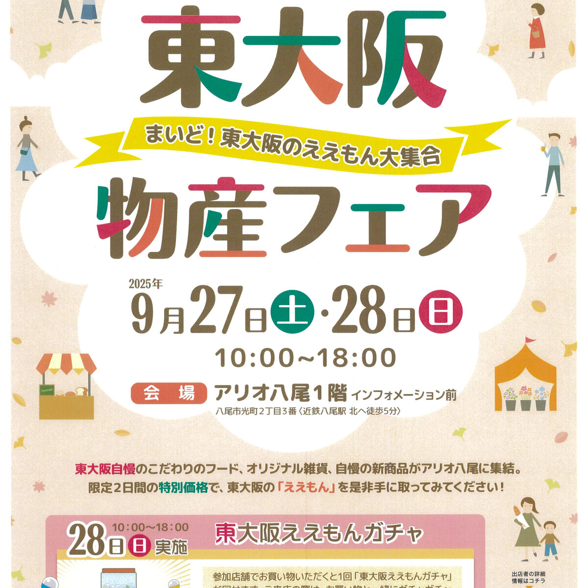 タイトルの通り、東大阪市のとなり町八尾市のショッピングモール「アリオ八尾」で明日開催されるイベント「東大阪物産フェア in アリオ八尾」に出店いたします。