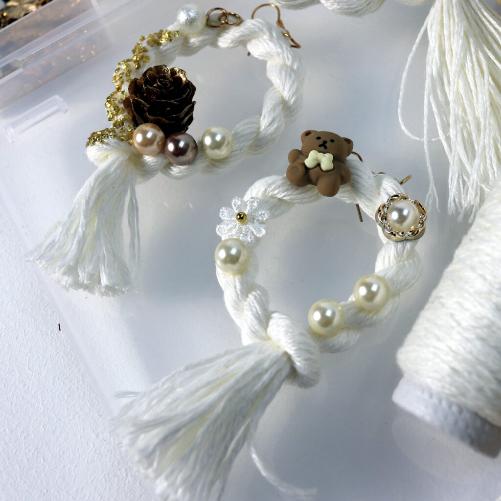 ワークショップはリネン糸を好きな組み合わせで6色選んでもらって工場の機械で撚糸して、その糸を参加者のみなさんでさらに手回し撚り機で紐にしてもらい、その紐でアクセサリーやオーナメントを作るという内容です。