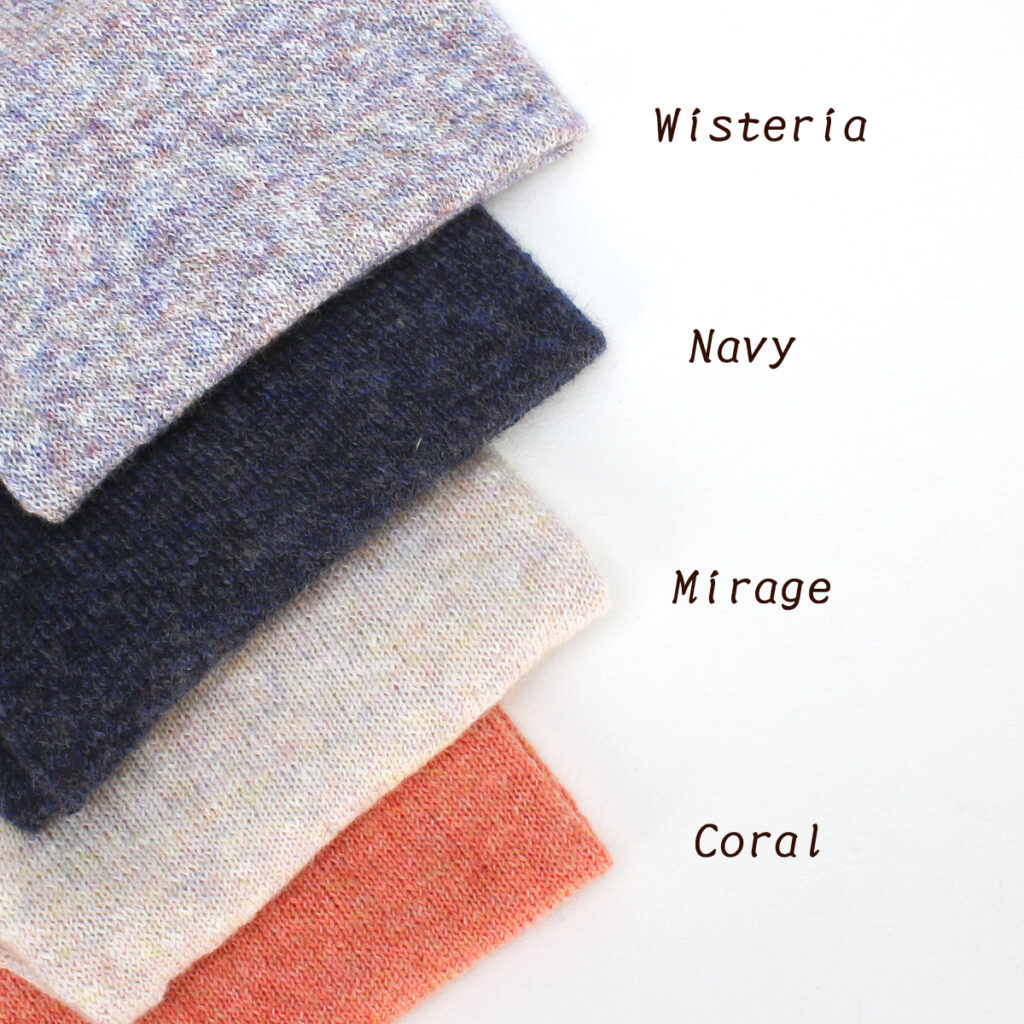 カラフルなメランジモヘヤとコットンのスラブ糸と撚り合わせているので、色合いもきれいでポコポコと表情のあるニットが出来上がりますよ。
